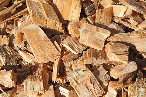 La leña que producimos la astillamos con una máquina BRUKS que corta estos restos en trozos de unos 4 cms. Se suele vender por estéreos.